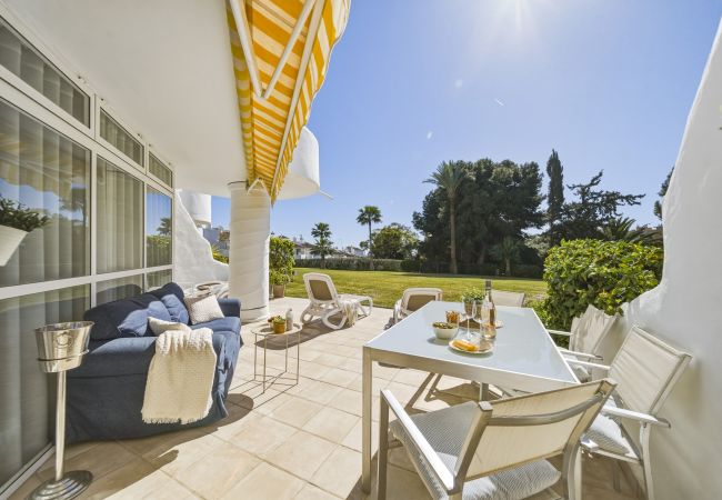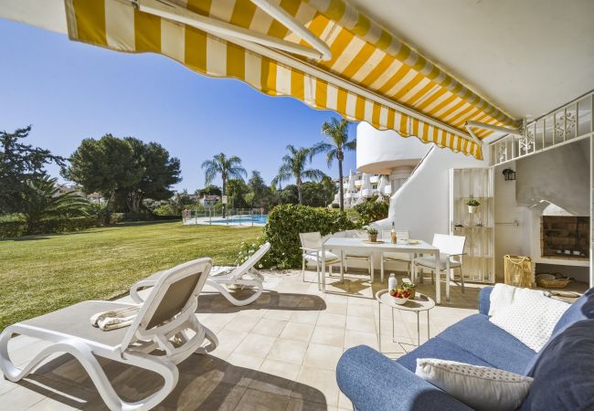 Este excelente apartamento de planta baja con jardín de 2 dormitorios, 1 baño (con ducha, sin bañera) en CALAHONDA GOLF tiene vistas al campo de golf de La Siesta.