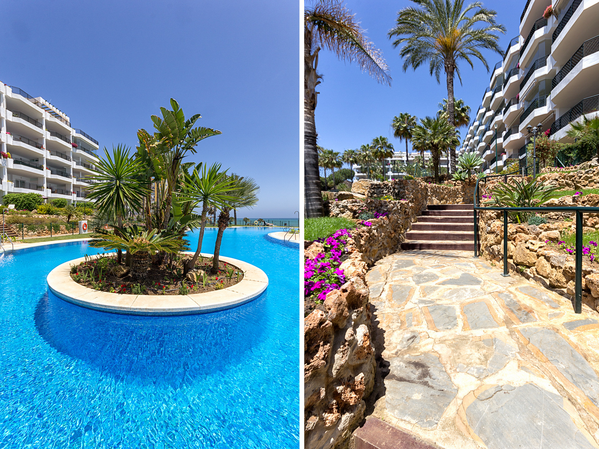 Beachfront 2 bedroom, 2 bathroom , 1st floor apartment offers sea views from the large, sunny , West facing terrace overlooking one of the complexes two large freeform pools. Set within attractive, tropical, landscaped gardens which lead right down to the beach, accessed through a private gate directly from the gardens.
