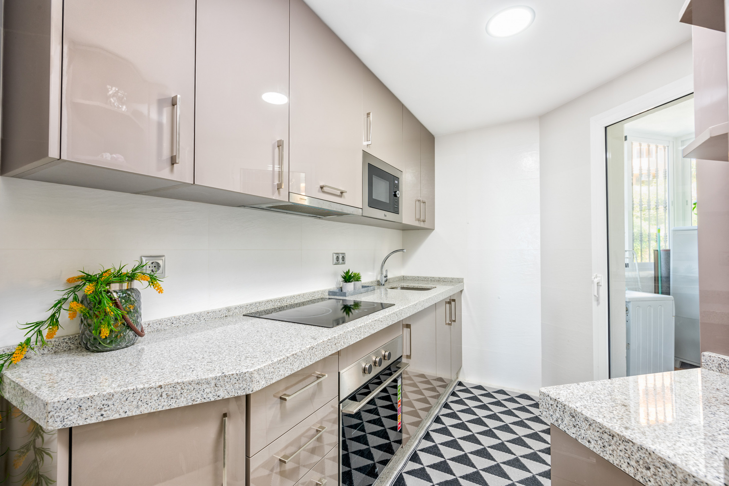 Fully fitted kitchen with dishwasher and washing machine.